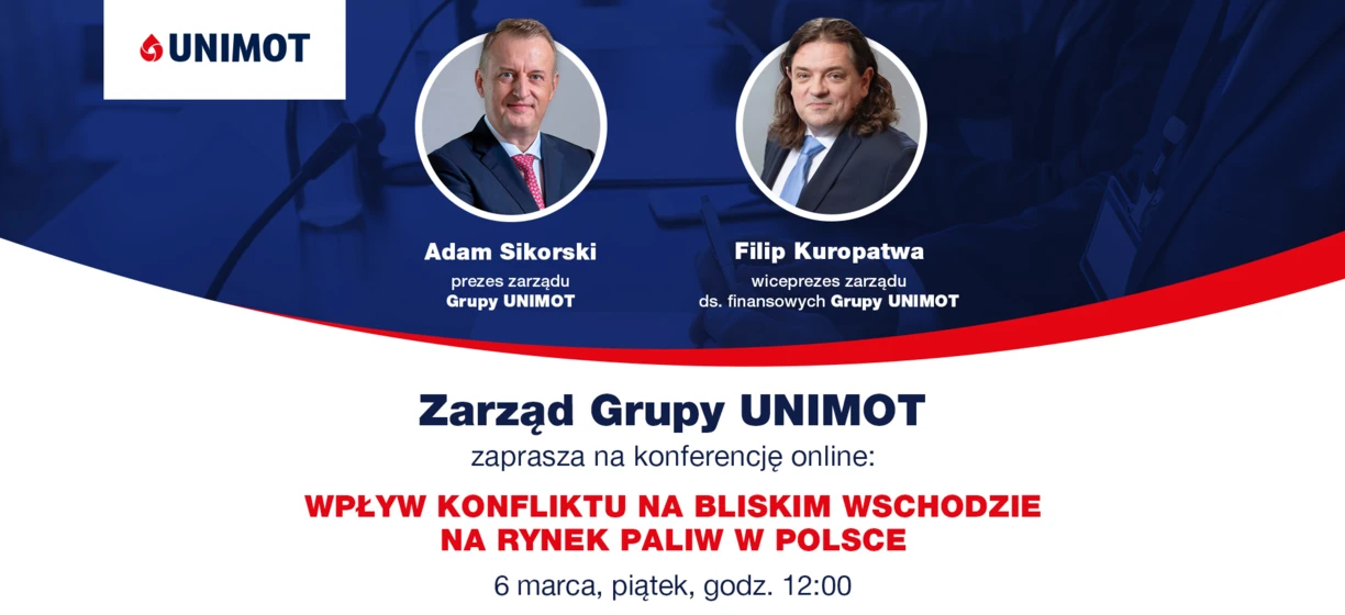 Zarząd UNIMOT zaprasza na konferencję online, podczas której omówiony zostanie wpływ konfliktu na Bliskim Wschodzie na rynek paliw w Polsce, ze szczególnym uwzględnieniem perspektywy Grupy UNIMOT.